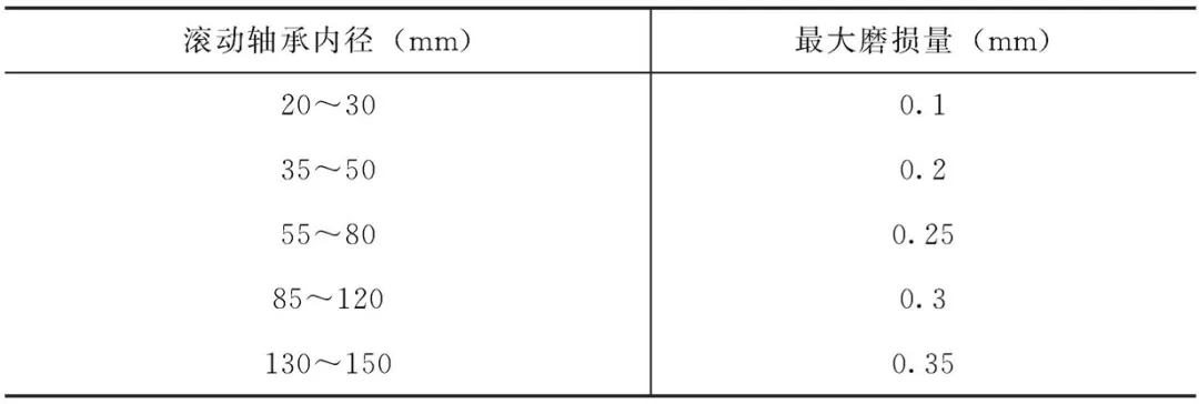 用手晃動(dòng)滾動(dòng)軸承(滾動(dòng)軸承拆下后)可用厚薄規(guī)檢查滾動(dòng)軸承的磨損情況,滾動(dòng)軸承的磨損超過(guò)磨損限度時(shí)應(yīng)更換新滾動(dòng)軸承,而且原則上應(yīng)換同規(guī)格的滾動(dòng)軸承。若無(wú)所需要的滾動(dòng)軸承型號(hào),在不得已的情況下,可使用另一規(guī)格的滾動(dòng)軸承來(lái)代替,但代用滾動(dòng)軸承的載重量應(yīng)適合所代替的滾動(dòng)軸承。代用滾動(dòng)軸承的幾何尺寸與原滾動(dòng)軸承稍有差別時(shí),應(yīng)加設(shè)止推環(huán)或內(nèi)、外套筒。不同軸徑對(duì)應(yīng)的滾動(dòng)軸承磨損許可值見下表。