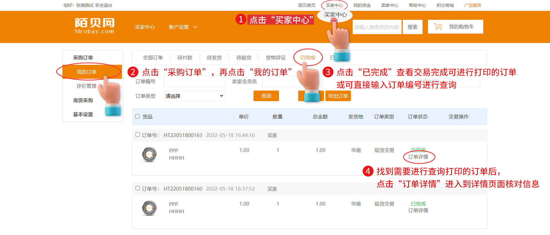 第2步:點(diǎn)擊“采購(gòu)訂單”,再點(diǎn)擊“我的訂單”